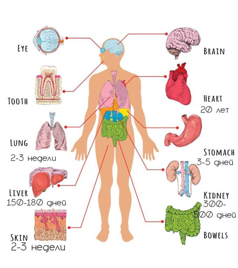 Сердце – полное обновление сердечной мускулатуры происходит примерно раз в 20 лет.